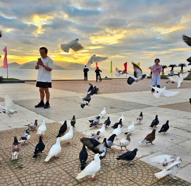 Một không gian mở rộng thênh thang trước mắt, tiếng sóng biển vỗ đều, từng cơn gió mằn mặn thổi qua mái tóc – tất cả làm nên một cảm giác vừa yên bình vừa lãng mạn đến kỳ lạ. Bạn sẽ không cảm thấy vội vã hay náo nhiệt như ban ngày. Thay vào đó, cả quảng trường như khoác lên mình một sắc thái mới: mềm mại, dịu dàng và đầy cảm xúc.